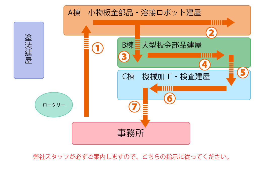 面接時に担当者と一緒に下記のルート通りに工場見学を行う予定です。